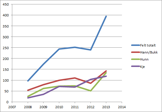 Grafen er basert på følgende data hentet fra hjorteviltregisteret.no.