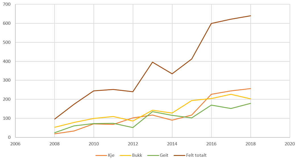 Vi har igjen gått inn på hjorteviltregisteret.no og sett på felte rådyr på Vega de siste 10 årene.